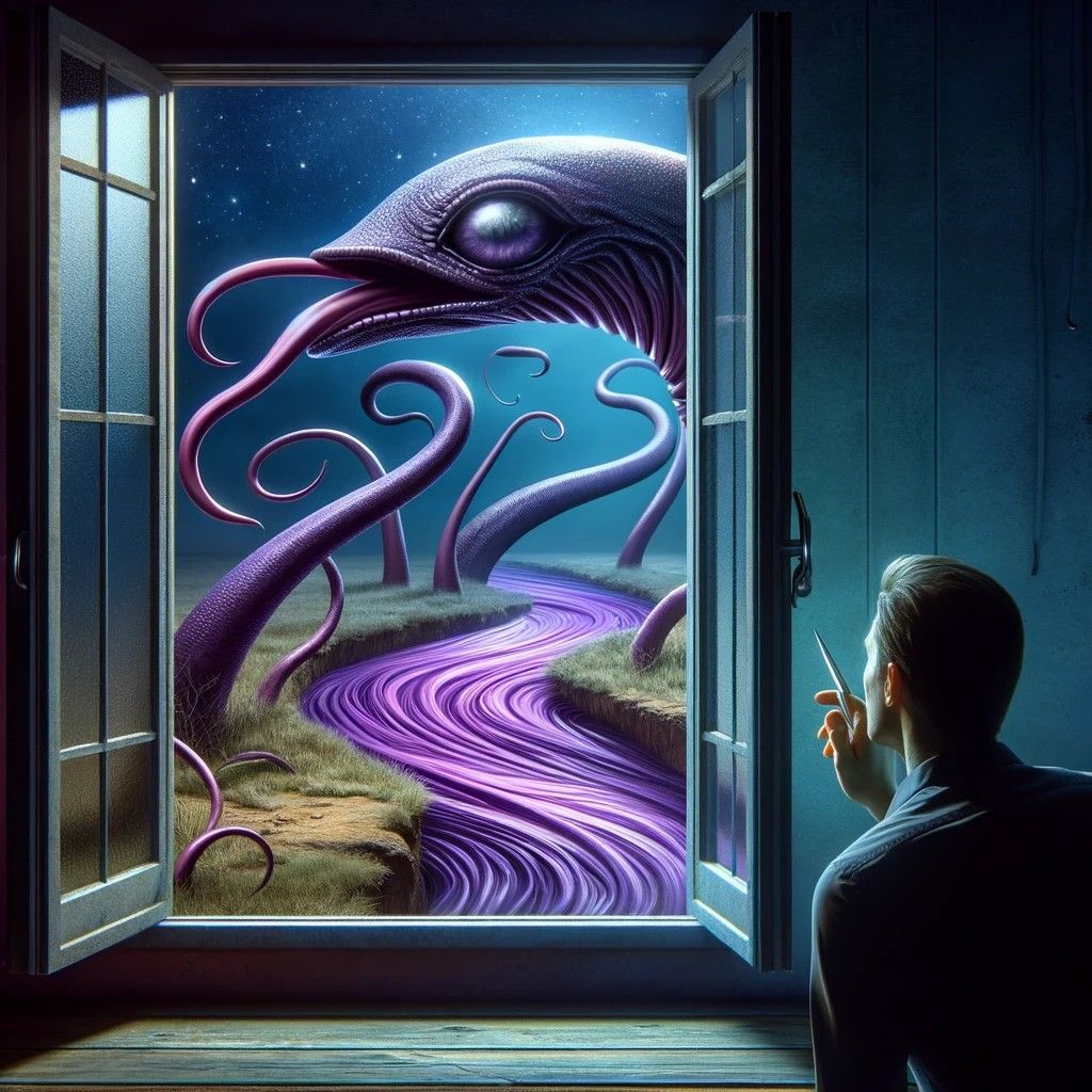 J’ai ouvert la fenêtre sur un fleuve de pourpre sinueux comme une sirène. Je m’approchais et je fus stupéfait que cet organisme soit encore plus étrange que je pensais. Est-ce une nouvelle espèce pas encore découverte ? Un extraterrestre ? Je ne saurais le dire, c’est la bestiole la plus bizarre que j’ai vu. À ce moment là, une longue tige lui sort du nez, et un petit oeil s’ouvre, juste en dessous de ma face. Une voix criarde sort d’on-ne-sait où