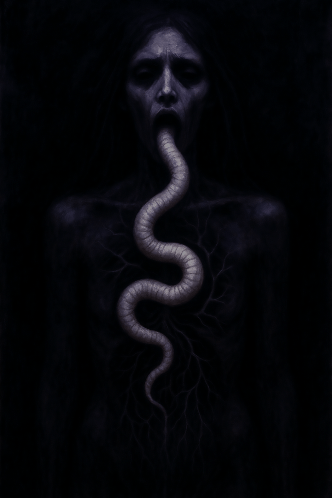Veræ se manifeste sous la forme d’un Ver blanc, vivant et tordu, qui se loge dans les entrailles de la personne. Il gesticule, se tord et s’enroule, impossible à expulser par les moyens conventionnels. Son mouvement n’est pas aléatoire : il agit comme un miroir de la surcharge intérieure, reflétant la honte, la culpabilité et la colère silencieuse des porteurs.