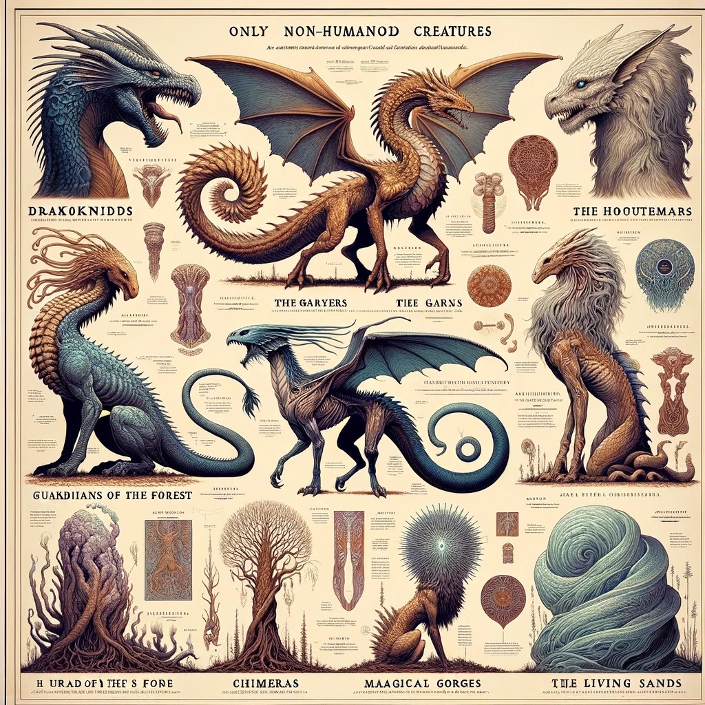 Les Drakonids des Cieux : Des créatures majestueuses ressemblant à des dragons, mais plus petites et intelligentes, habitent les Îles Célestes. Ils volent entre les îles et gardent les secrets des hauteurs célestes.